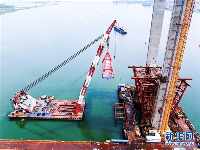 這是5月29日拍攝的廣東湛江調(diào)順跨海大橋施工現(xiàn)場(無人機(jī)照片)。 新華社記者 盧燁 攝
