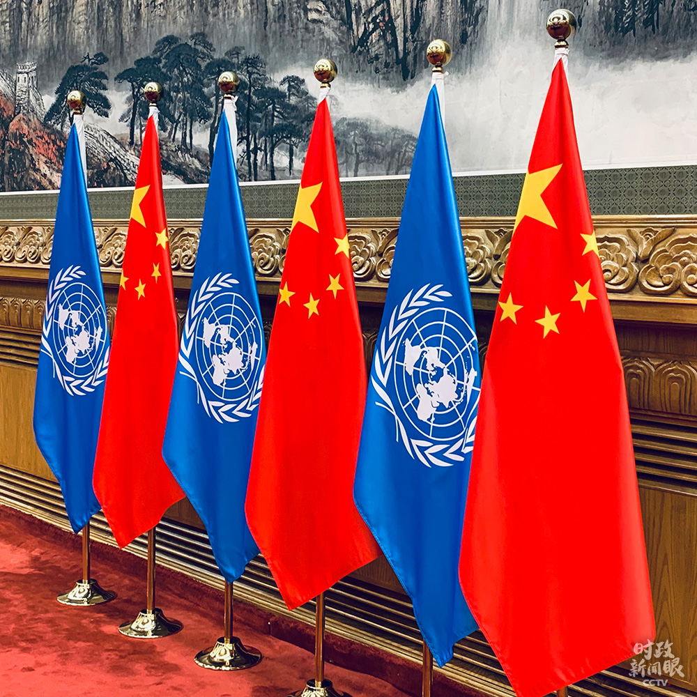 △視頻會(huì)見(jiàn)現(xiàn)場(chǎng)擺放的中國(guó)國(guó)旗和聯(lián)合國(guó)旗(總臺(tái)央視記者范一鳴拍攝)