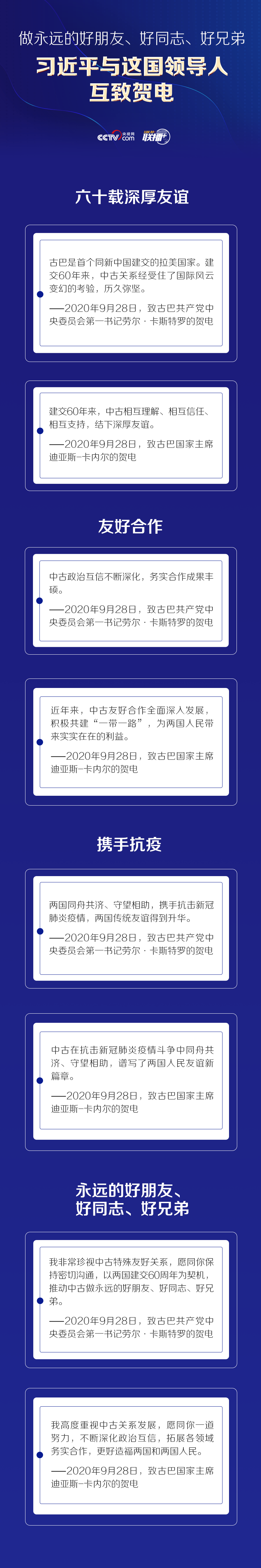 古巴是首個(gè)同新中國(guó)建交的拉美國(guó)家。建交60年來(lái),中古關(guān)系經(jīng)受住了國(guó)際風(fēng)云變幻的考驗(yàn),歷久彌堅(jiān)。在新冠肺炎疫情疊加百年未有之大變局的背景下,習(xí)近平主席與古巴共產(chǎn)黨中央委員會(huì)第一書記勞爾·卡斯特羅、古巴國(guó)家主席迪亞斯-卡內(nèi)爾互致賀電,共話中古友誼,央視網(wǎng)《聯(lián)播+》特為您梳理。