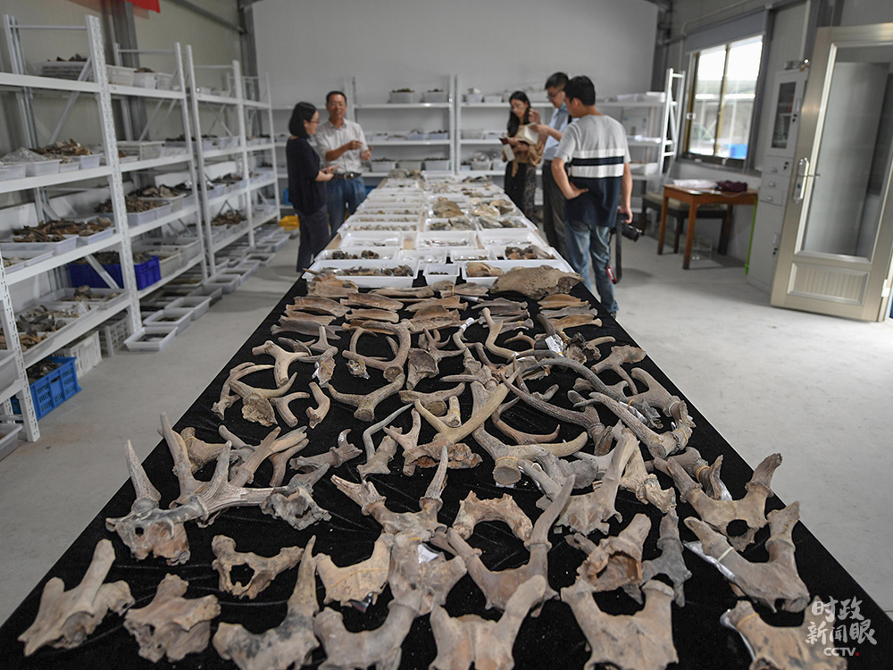 △井頭山遺址埋深5至10米,是迄今浙江和長三角地區(qū)首個(gè)沿海貝丘遺址。文物庫房內(nèi)擺放大量鹿角、貝殼等。
