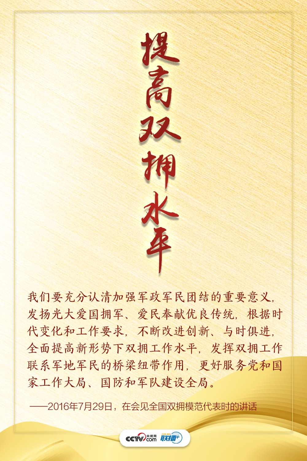 習(xí)近平總書記始終高度重視雙擁工作,多次在重要會議、國內(nèi)考察時親力親為指導(dǎo)推動。他強調(diào)擁軍優(yōu)屬、擁政愛民是我黨我軍特有的政治優(yōu)勢,堅如磐石的軍政軍民關(guān)系是我們戰(zhàn)勝一切艱難險阻、不斷從勝利走向勝利的重要法寶。