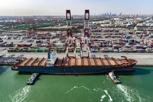 10月27日,一艘貨輪停靠天津港。天津港集團(tuán)正式開通運(yùn)營(yíng)今年第四條“一帶一路”新航線(無人機(jī)照片)。新華社發(fā)