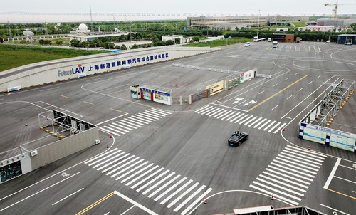 測試車輛在上海浦東新區(qū)臨港智能網聯(lián)汽車綜合測試示范區(qū)內進行行駛測試(7月3日攝,無人機照片)。新華社記者 方喆 攝