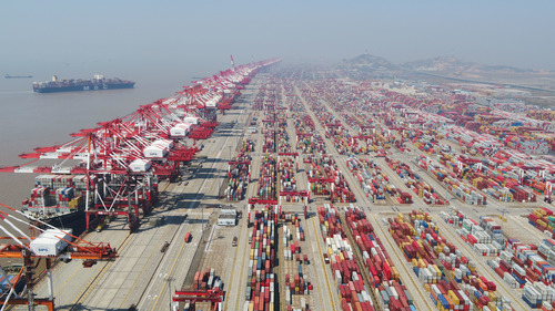 上海洋山港集裝箱碼頭(3月18日攝,無人機照片)。新華社記者 丁汀 攝