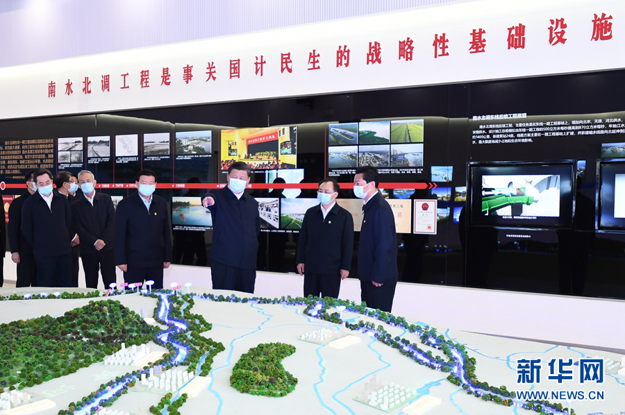 一個(gè)大型沙盤模型直觀地呈現(xiàn)了中國(guó)大地上水資源大范圍大規(guī)模跨區(qū)域調(diào)配的壯闊景象,習(xí)近平總書記駐足凝望——