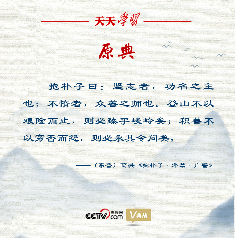 在《外篇·廣譬》中,葛洪提出:“堅(jiān)志者,功名之主也;不惰者,眾善之師也。登山不以艱險(xiǎn)而止,則必臻乎峻嶺矣;積善不以窮否而怨,則必永其令問(wèn)矣。”意思是意志堅(jiān)定,是建功立業(yè)的主導(dǎo);勤奮不怠,是一切善行的老師。登山不因?yàn)槠D難險(xiǎn)阻而停止,就一定會(huì)到達(dá)頂峰;行善不因?yàn)樽陨砀F困與否而埋怨,就一定會(huì)使自己的美譽(yù)長(zhǎng)久。用登山作譬,指出意志堅(jiān)定和勤奮不怠是事業(yè)成功的重要保證。