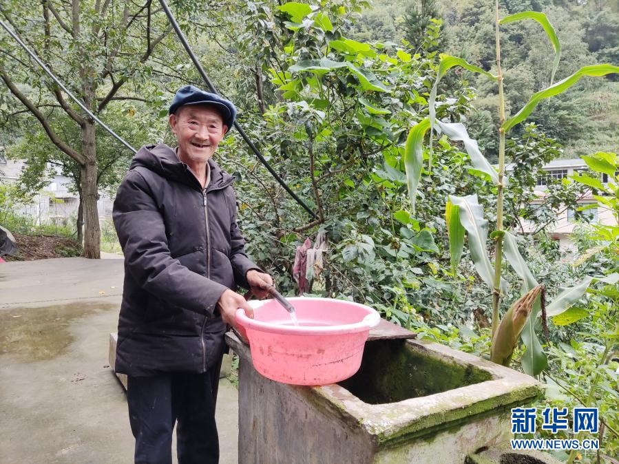 云南省鎮(zhèn)雄縣中屯鎮(zhèn)齊心村70歲的貧困戶王建春在家門口接水(9月23日攝)。新華社記者 林碧鋒 攝
