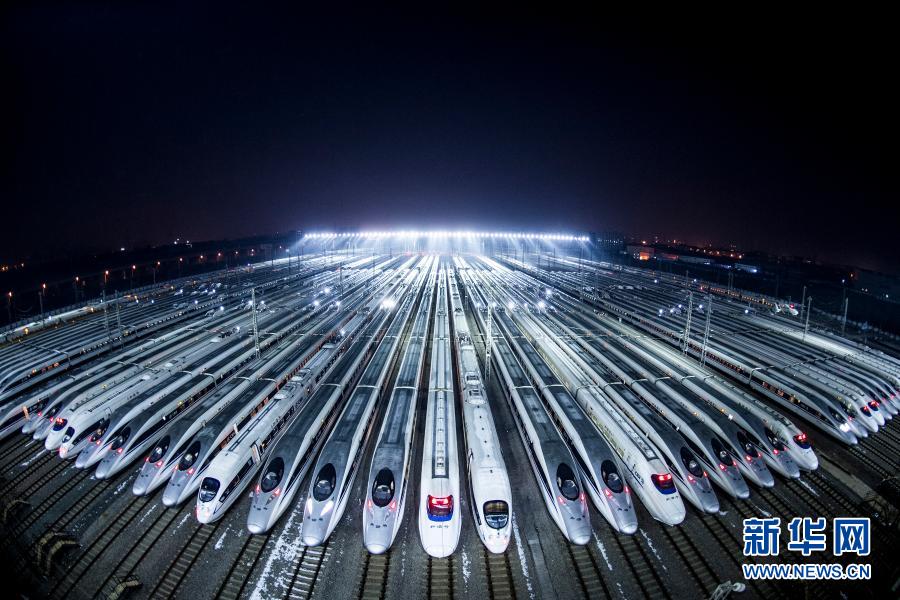 動車組??吭谖錆h動車段的存車線上,準(zhǔn)備進(jìn)行檢修和保溫作業(yè)(2018年2月1日攝)。新華社記者 肖藝九 攝