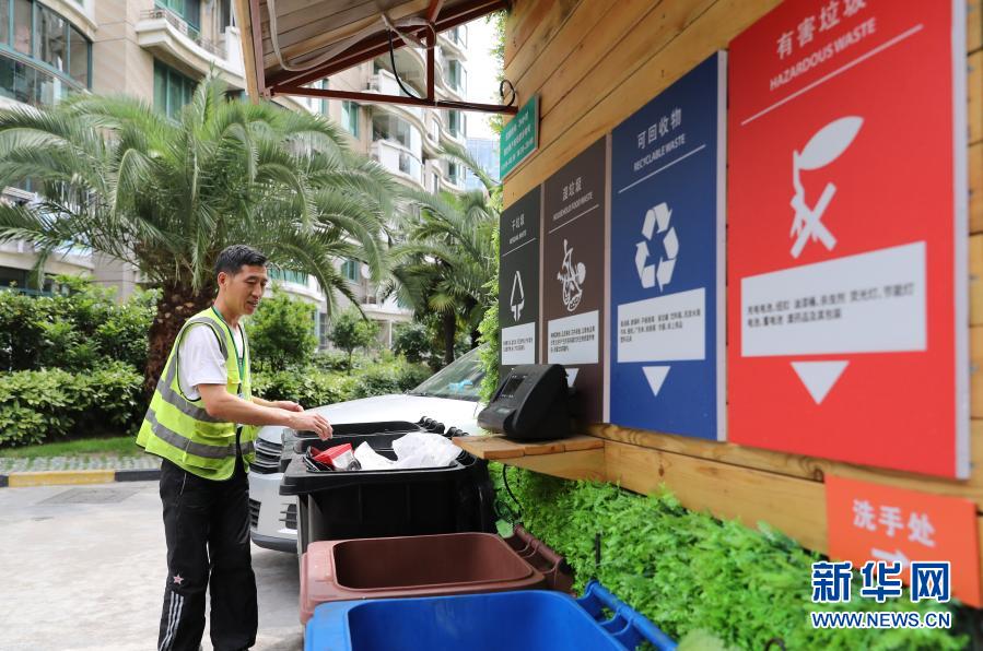 在上海市虹口區(qū)嘉興路街道一處小區(qū),保潔工對居民分類投放的生活垃圾進(jìn)行分揀(2019年6月24日攝)。新華社記者 方喆 攝