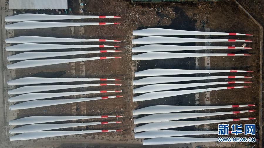 這是河北省威縣一家風(fēng)電設(shè)施生產(chǎn)企業(yè)內(nèi)的大型風(fēng)電機組葉片(12月8日攝,無人機照片)。新華社記者 牟宇 攝