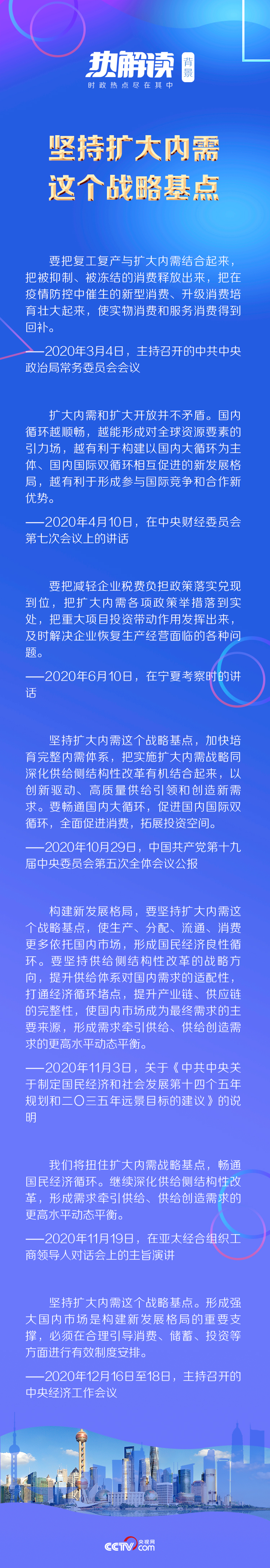 《熱解讀》梳理發(fā)現(xiàn),“擴大內需”一詞在今年的高層會議中被反復提及,3月4日召開的中共中央政治局常務委員會會議指出“要把復工復產與擴大內需結合起來,把被抑制、被凍結的消費釋放出來”;9月8日,習近平總書記在全國抗擊新冠肺炎疫情表彰大會上強調“牢牢把握擴大內需這個戰(zhàn)略基點,保護和激發(fā)市場主體活力”;黨的十九屆五中全會提出“堅持擴大內需這個戰(zhàn)略基點,加快培育完整內需體系,把實施擴大內需戰(zhàn)略同深化供給側結構性改革有機結合起來,以創(chuàng)新驅動、高質量供給引領和創(chuàng)造新需求”……