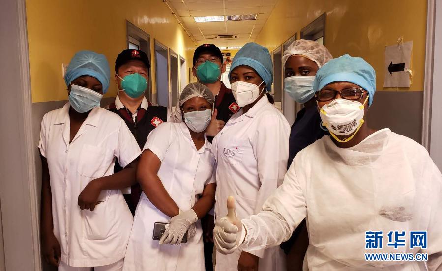 5月26日,中國抗疫醫(yī)療專家組在剛果(布)首都布拉柴維爾指導新冠肺炎病房建設時,與當?shù)匾痪€醫(yī)務人員合影。新華社發(fā)