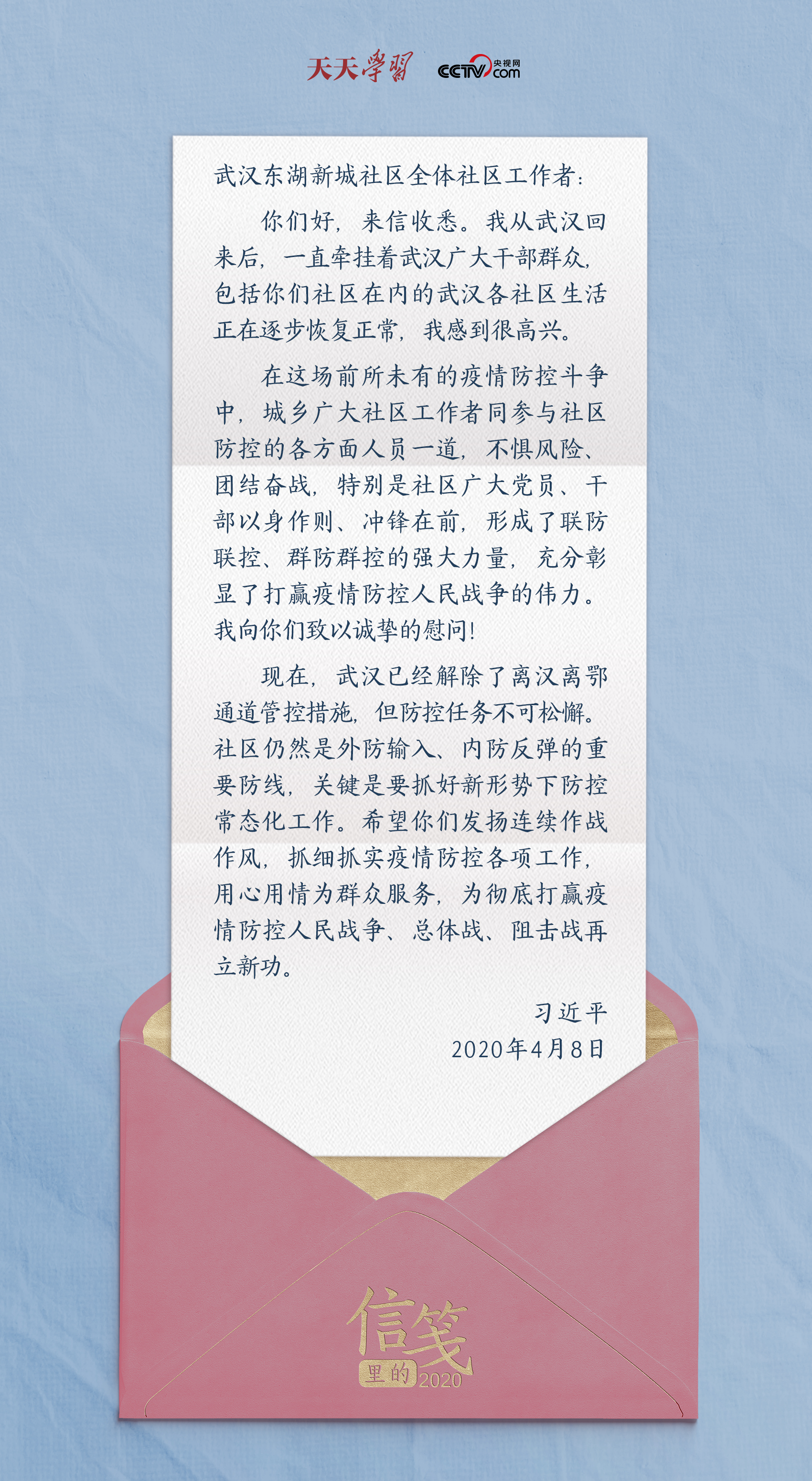 4月8日,武漢解封。在給武漢東湖新城社區(qū)全體社區(qū)工作者的回信中,總書記再次肯定城鄉(xiāng)廣大社區(qū)工作者在疫情防控斗爭中發(fā)揮的重要作用,并鼓勵(lì)他們“抓細(xì)抓實(shí)疫情防控各項(xiàng)工作,用心用情為群眾服務(wù)”,再立新功。