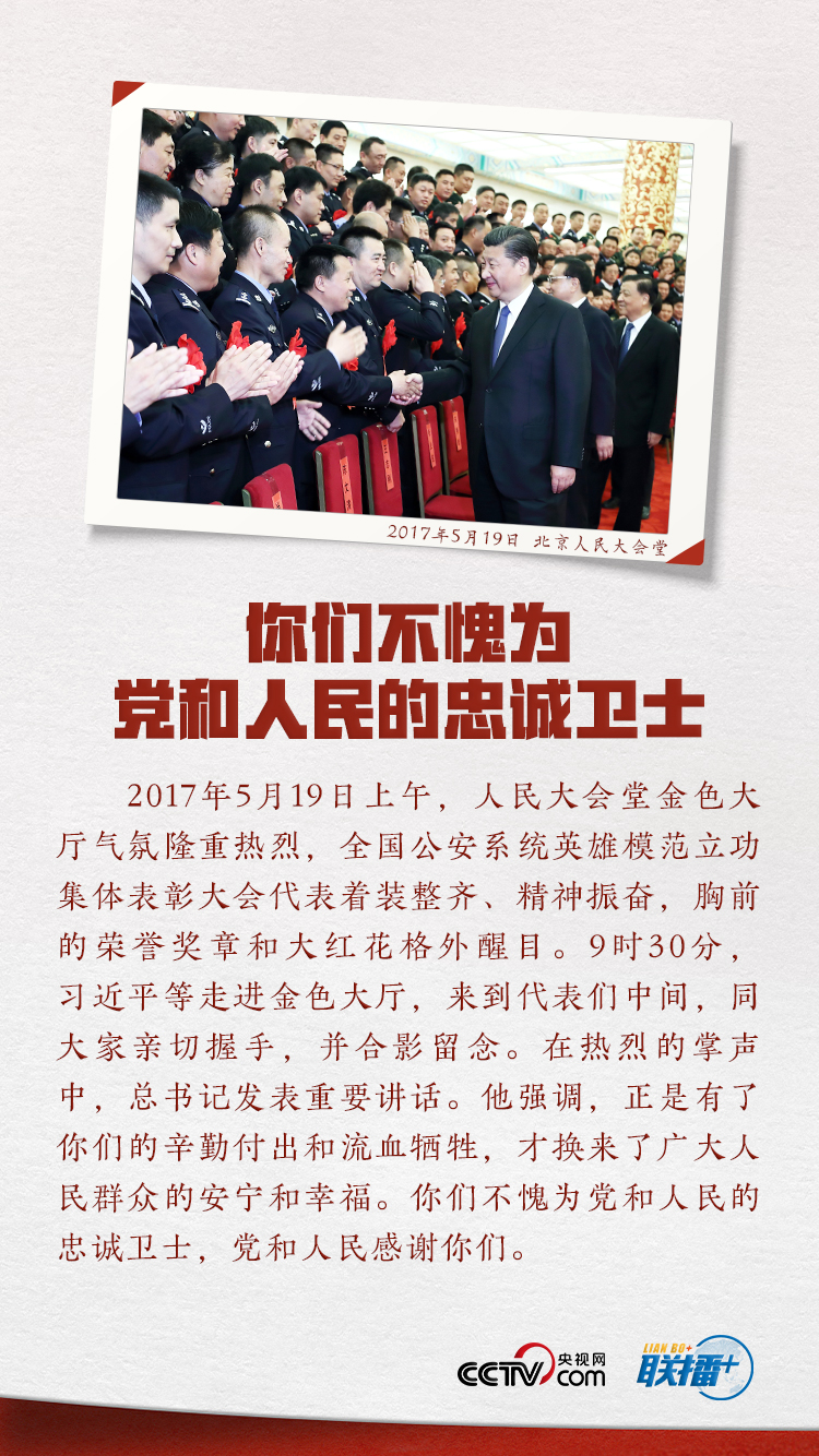 一直以來,習(xí)近平總書記對政法工作、對人民警察隊(duì)伍高度重視。黨的十八大以來,總書記多次會見全國公安系統(tǒng)的英模代表,多次到基層看望慰問人民警察,在不同場合多次表達(dá)對這支隊(duì)伍的關(guān)心關(guān)愛。央視網(wǎng)《聯(lián)播+》欄目特選取六幅珍貴畫面,結(jié)合總書記相關(guān)重要講話,為您展示人民領(lǐng)袖對人民警察的深情厚望。