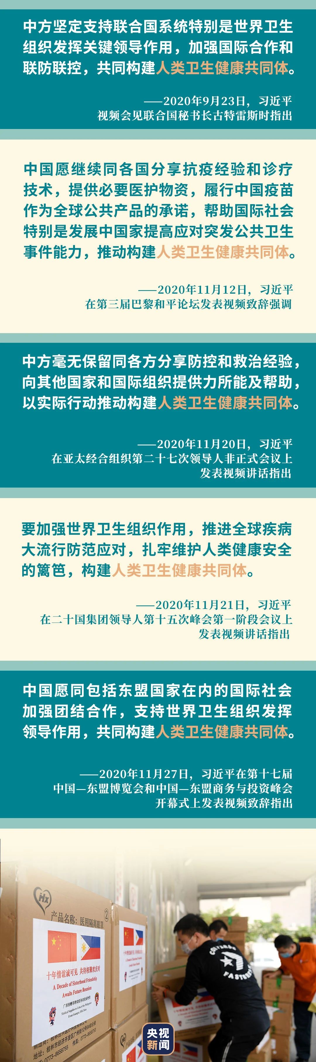 疫情發(fā)生以來,中國積極履行國際義務,密切同世界衛(wèi)生組織和相關國家的友好合作,主動同國際社會分享疫情和病毒信息、抗疫經驗做法。向150多個國家和10個國際組織提供抗疫援助,向34個國家派出36支醫(yī)療專家組,向各國提供2200多億只口罩、22.5億件防護服、10.2億份檢測試劑盒,加入“新冠肺炎疫苗實施計劃”,承諾將疫苗作為全球公共產品……中國履行國際義務,發(fā)揮全球抗疫物資最大供應國作用,共同構建人類衛(wèi)生健康共同體。