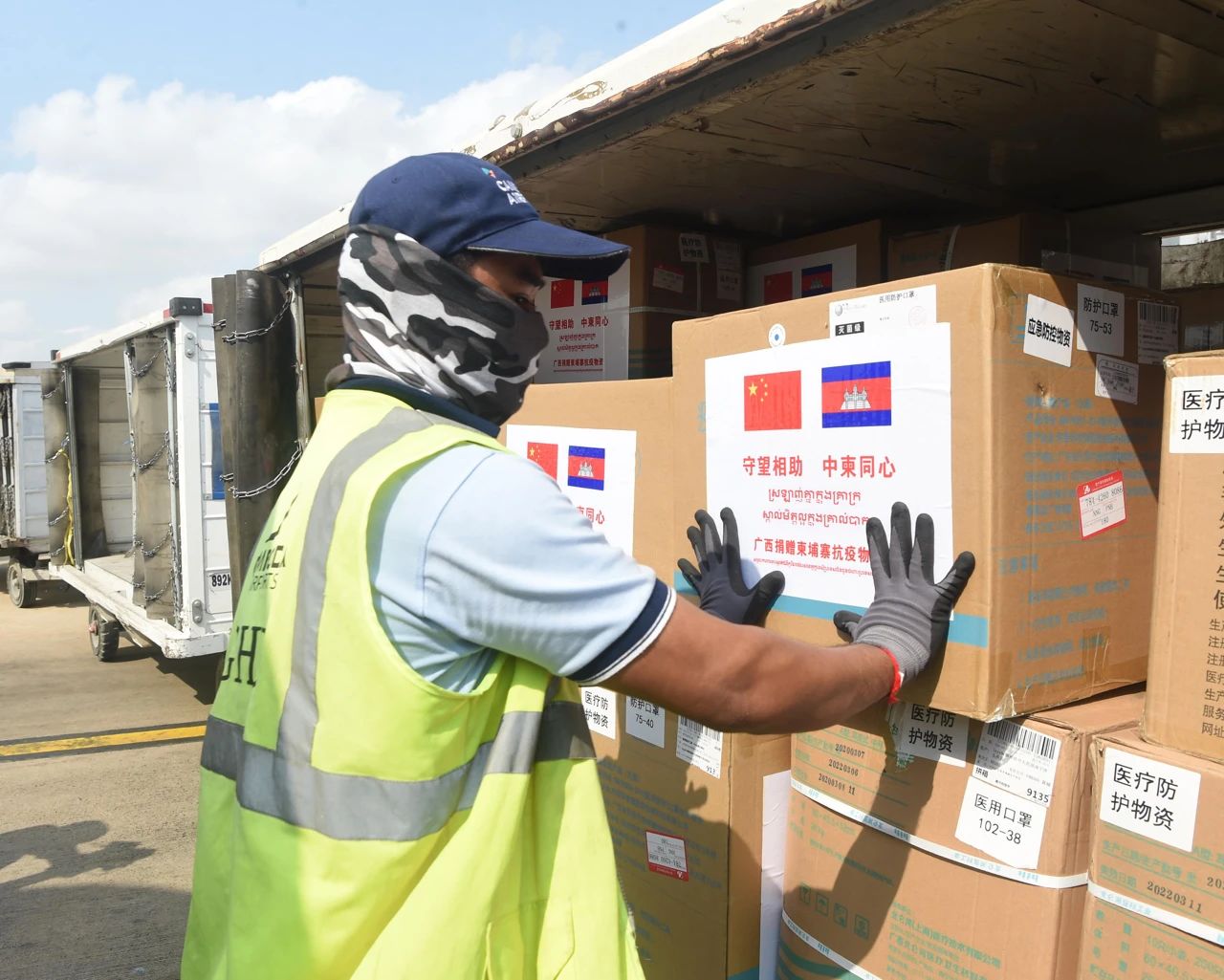 △2020年3月23日,一架搭載7名來自廣西壯族自治區(qū)醫(yī)療專家和一批防疫醫(yī)療物資的中國南航包機降落在柬埔寨首都金邊國際機場。