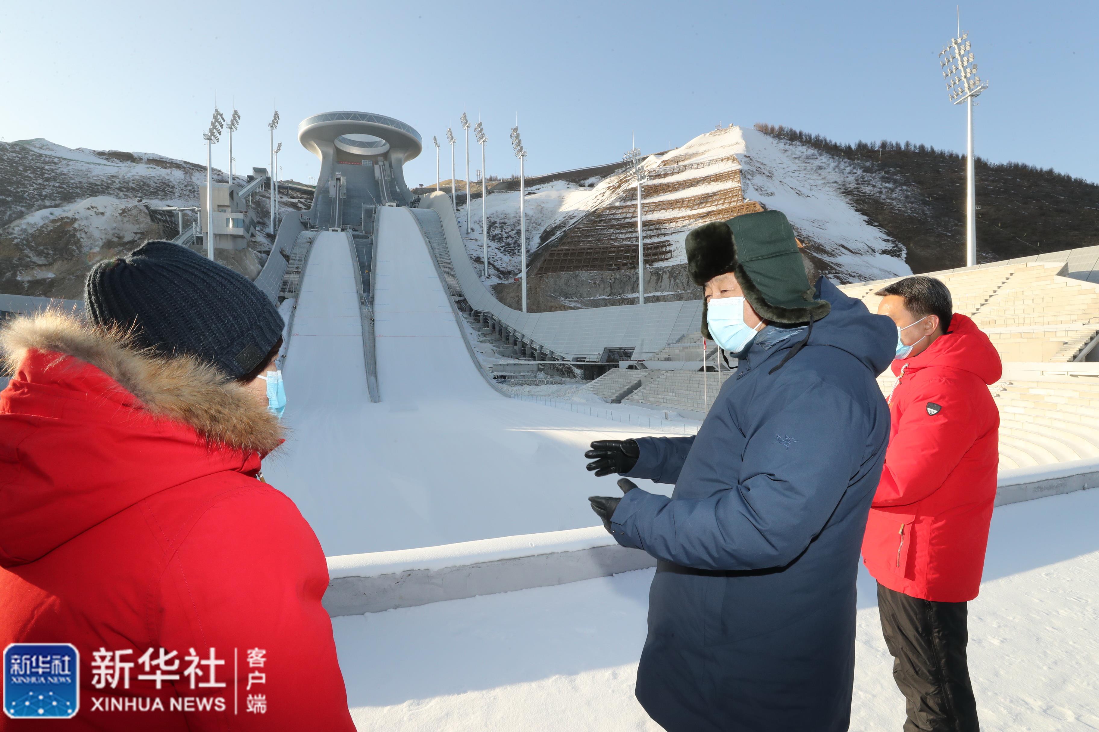 ↑1月18日至20日,中共中央總書記、國家主席、中央軍委主席習(xí)近平在北京、河北考察,并主持召開北京2022年冬奧會和冬殘奧會籌辦工作匯報會。這是19日下午,習(xí)近平在張家口賽區(qū)國家跳臺滑雪中心,察看跳臺滑雪運動員訓(xùn)練演示。 新華社記者 鞠鵬 攝