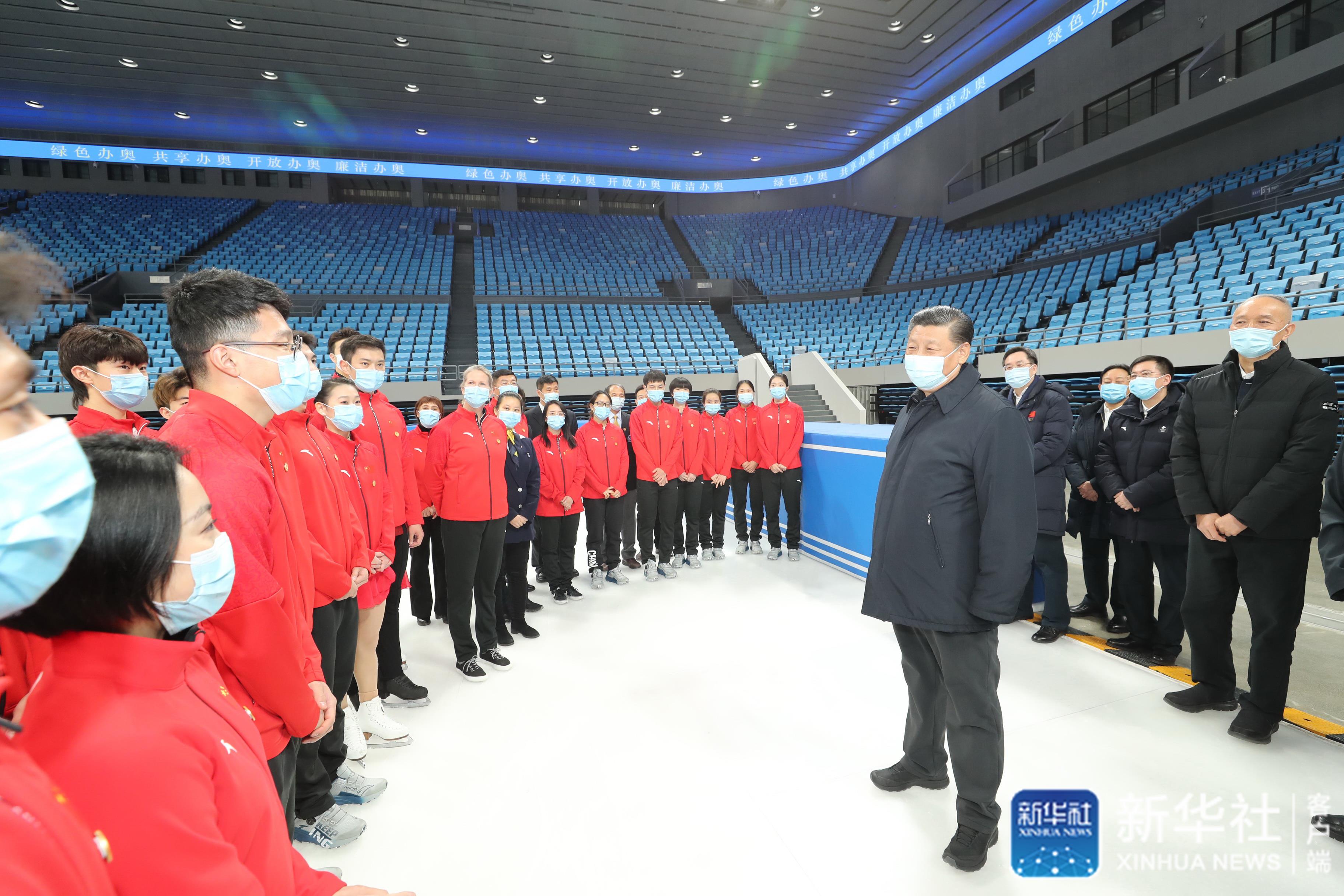 ↑1月18日至20日,中共中央總書記、國家主席、中央軍委主席習(xí)近平在北京、河北考察,并主持召開北京2022年冬奧會和冬殘奧會籌辦工作匯報會。這是18日上午,習(xí)近平在位于北京市海淀區(qū)的首都體育館,同國家花樣滑冰隊和短道速滑隊運動員、教練員等親切交流。 新華社記者 王曄 攝
