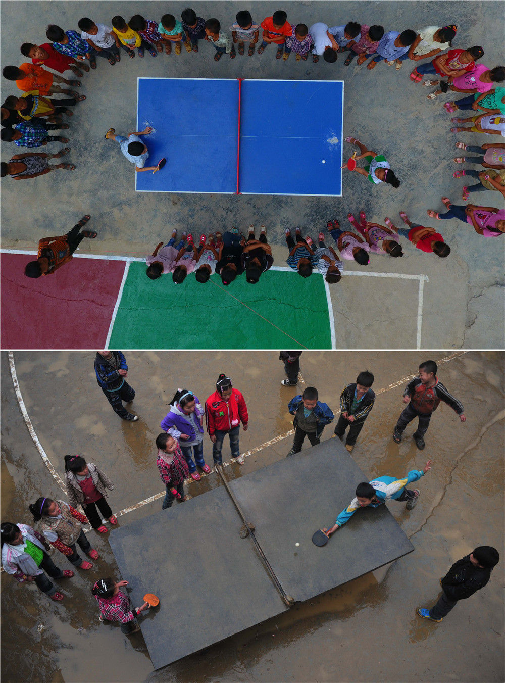拼版照片:上圖為在廣西大化瑤族自治縣板升鄉(xiāng)弄勇小學(xué),孩子們在打乒乓球(2017年9月4日攝,無人機(jī)照片);下圖為在弄勇小學(xué),孩子們在打乒乓球(2012年12月26日攝)。新華社記者 黃孝邦 攝