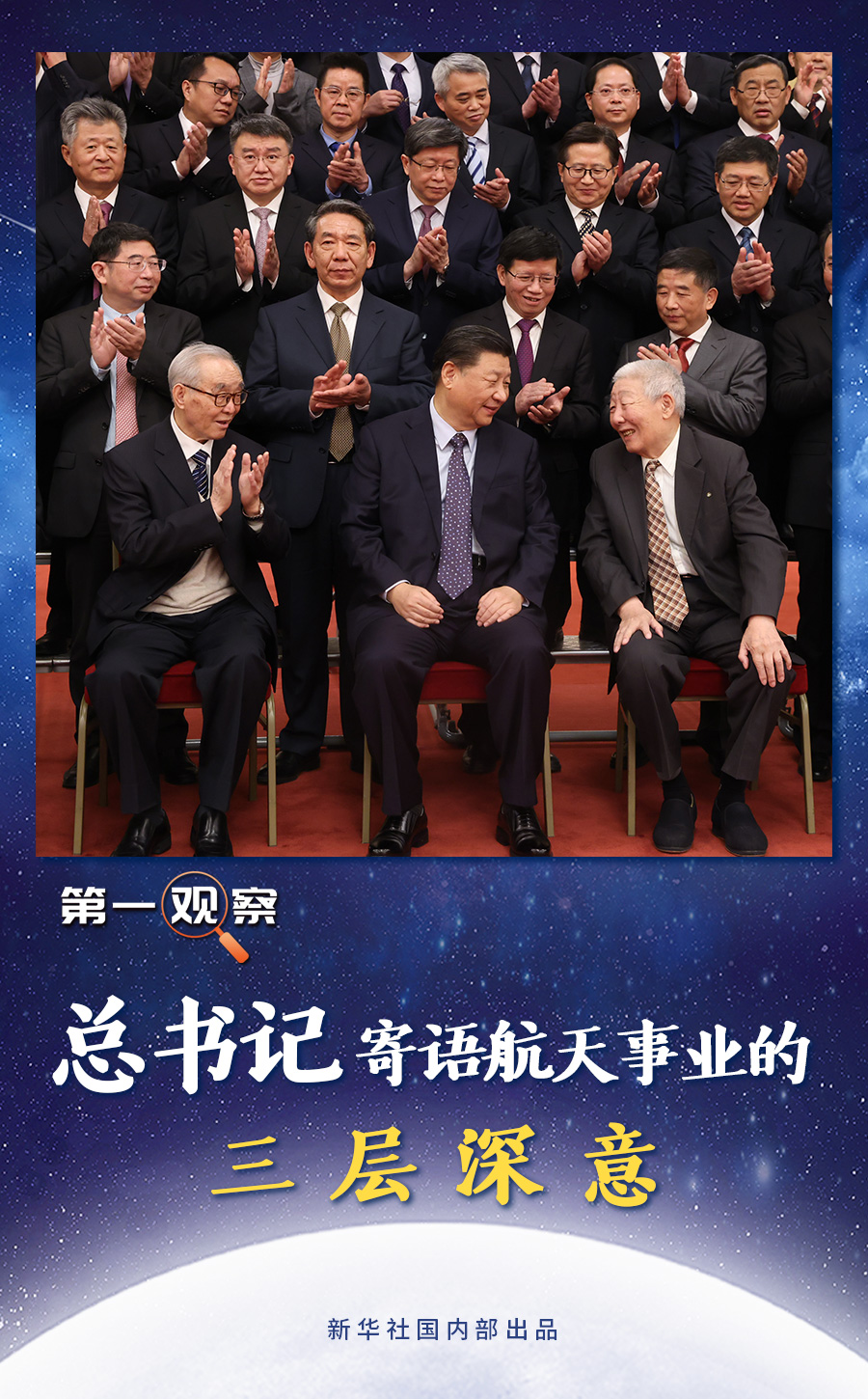 在與嫦娥五號任務(wù)參研參試人員代表合影時,習(xí)近平總書記身邊就座的,是兩位特殊的“90后”和“80后”:已經(jīng)90多歲高齡的探月工程首任總設(shè)計師孫家棟院士和年逾八旬的探月工程首任總指揮欒恩杰院士。合影前后,總書記同他們親切交流。
