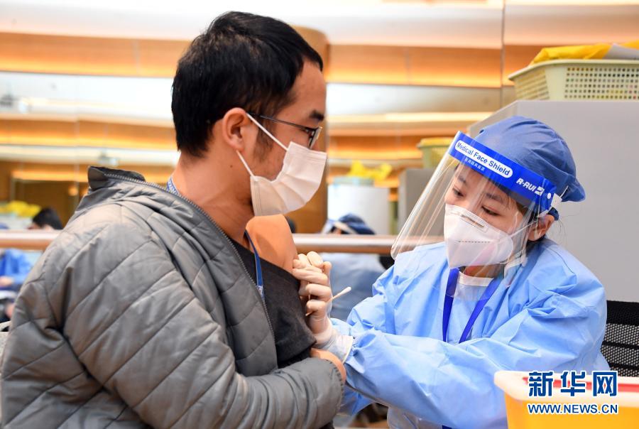 2月22日,在北京市海淀區(qū)中關村軟件園二期一家企業(yè)內(nèi)的臨時接種點,醫(yī)務人員為企業(yè)員工接種新冠疫苗。新華社記者 任超 攝