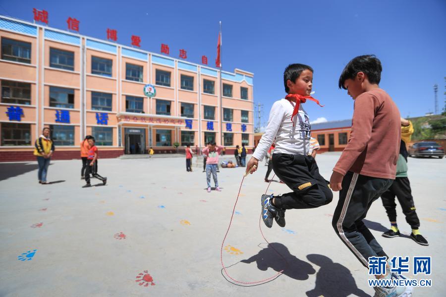 2020年5月29日,甘肅省臨夏回族自治州東鄉(xiāng)族自治縣龍泉鎮(zhèn)拱北灣小學學生馬有蘇夫(前左)和同學跳繩。新華社記者 馬希平 攝