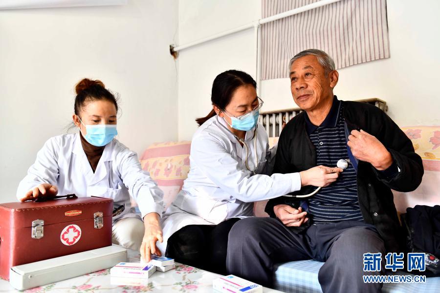 2020年11月11日,在山東省濰坊市寒亭區(qū)寒亭街道東院社區(qū),衛(wèi)生室醫(yī)生王紅霞(中)為村民張勇臣看病。寒亭區(qū)探索實施醫(yī)保服務下沉舉措,構建起覆蓋全區(qū)基層醫(yī)療機構的醫(yī)保服務下沉網(wǎng)絡,讓群眾在家門口便捷地享受醫(yī)保紅利。新華社記者 郭緒雷 攝