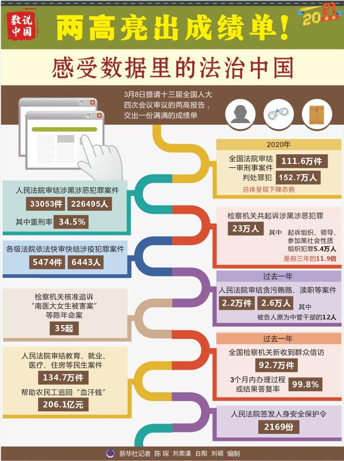 8日提請十三屆全國人大四次會(huì)議審議的兩高報(bào)告,交出一份滿滿的成績單。掃黑除惡“打傘破網(wǎng)”、嚴(yán)懲腐敗守護(hù)平安、加強(qiáng)民生司法保障……一串串?dāng)?shù)字勾勒出法治中國建設(shè)的亮點(diǎn)。