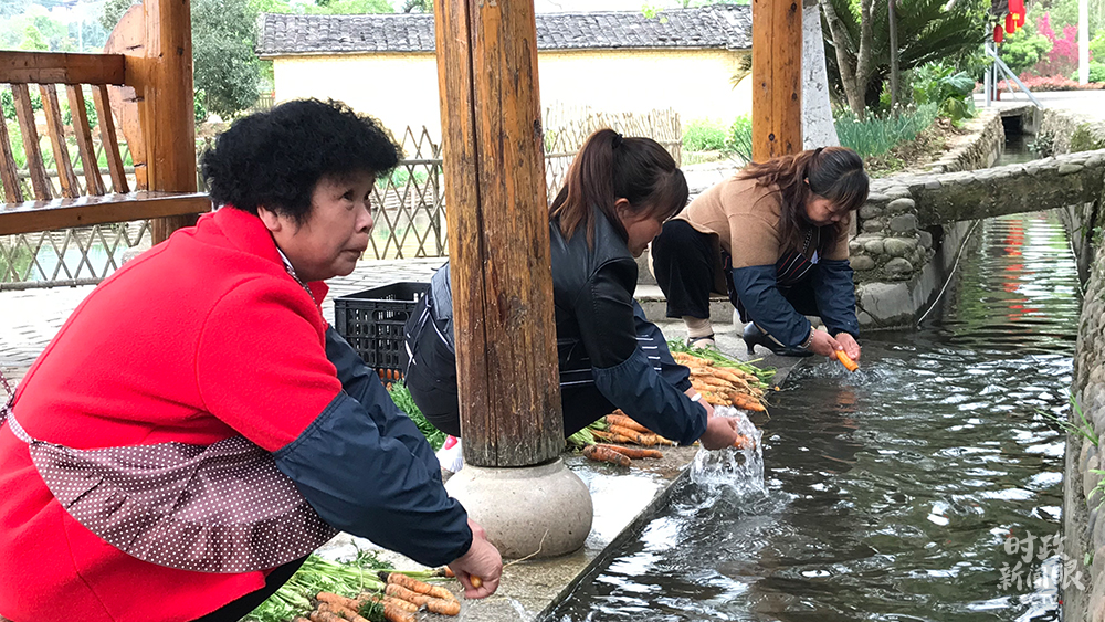 △俞邦村村民在村莊溪流中洗菜。(總臺(tái)央視記者石偉明拍攝)