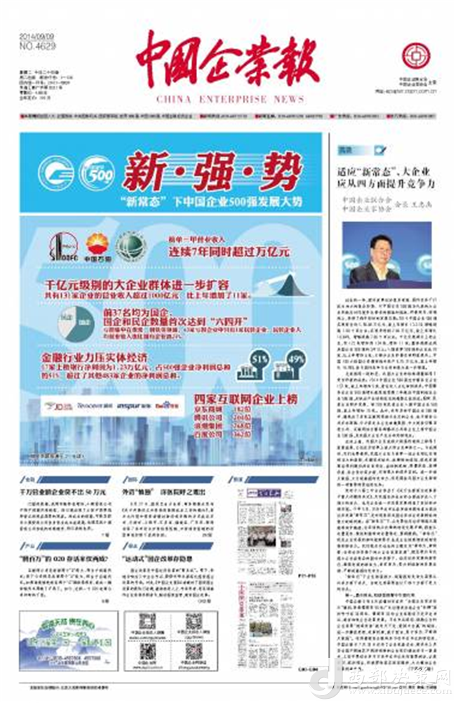 《中國企業(yè)報(bào)》是由中國企業(yè)聯(lián)合會、中國企業(yè)家協(xié)會主管主辦,是中國唯一以企業(yè)和企業(yè)家為報(bào)道核心的中央級媒體?!吨袊髽I(yè)報(bào)》是一張專為中國企業(yè)創(chuàng)辦的報(bào)紙。1988年1月4日,由國家經(jīng)委主辦,中國企業(yè)管理協(xié)會承辦的《中國企業(yè)報(bào)》正式創(chuàng)刊。陳云同志為報(bào)紙題寫了報(bào)頭,鄧力群任報(bào)社名譽(yù)顧問,袁寶華任報(bào)社名譽(yù)社長。從1988年創(chuàng)辦至今,秉承“面向企業(yè),為企業(yè)服務(wù)”的辦報(bào)宗旨,親歷和記錄著中國企業(yè)的改革進(jìn)程,同時(shí)伴隨著中國企業(yè)的發(fā)展壯大而不斷成長。經(jīng)過20多年的實(shí)踐探索,在報(bào)道企業(yè)新聞、推動(dòng)企業(yè)改革、維護(hù)企業(yè)權(quán)益、促進(jìn)企業(yè)發(fā)展等方面,逐步形成了自身的風(fēng)格和特色,專業(yè)性、權(quán)威性日益得到了企業(yè)界和新聞界的認(rèn)同。
