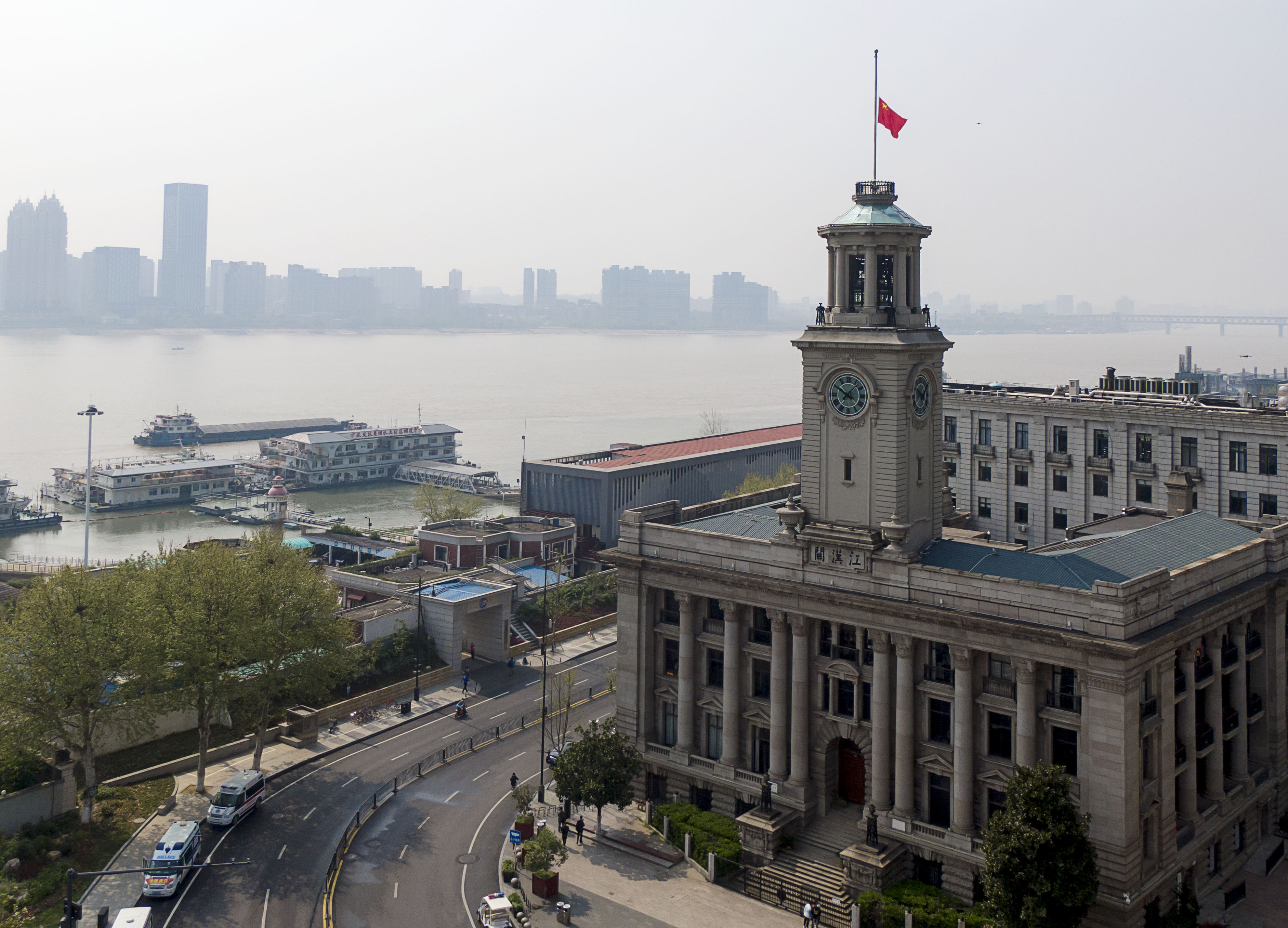 ↑2020年4月4日,武漢市舉行哀悼活動,表達(dá)對抗擊新冠肺炎疫情斗爭犧牲烈士和逝世同胞的深切哀悼。這是武漢江漢關(guān)大樓下半旗志哀。新華社記者 熊琦 攝