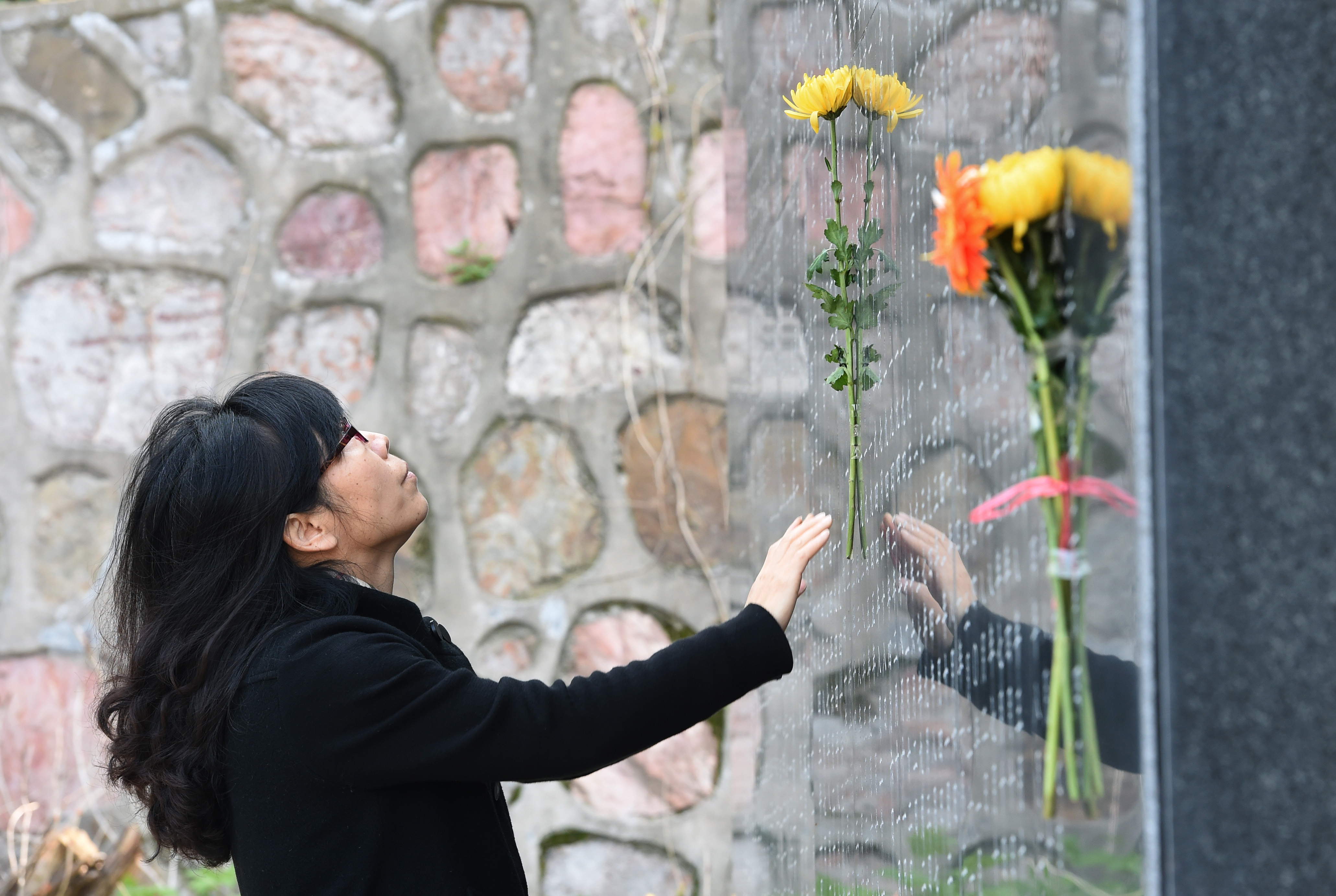 ↑2017年4月1日,抗日航空烈士湯卜生的孫女湯偉華在南京抗日航空烈士紀(jì)念碑廣場上刻有湯卜生名字的紀(jì)念碑上粘貼菊花。新華社記者孫參攝