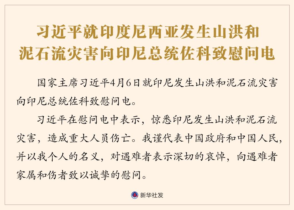 習(xí)近平在慰問電中表示,驚悉印尼發(fā)生山洪和泥石流災(zāi)害,造成重大人員傷亡。我謹(jǐn)代表中國(guó)政府和中國(guó)人民,并以我個(gè)人的名義,對(duì)遇難者表示深切的哀悼,向遇難者家屬和傷者致以誠(chéng)摯的慰問。
