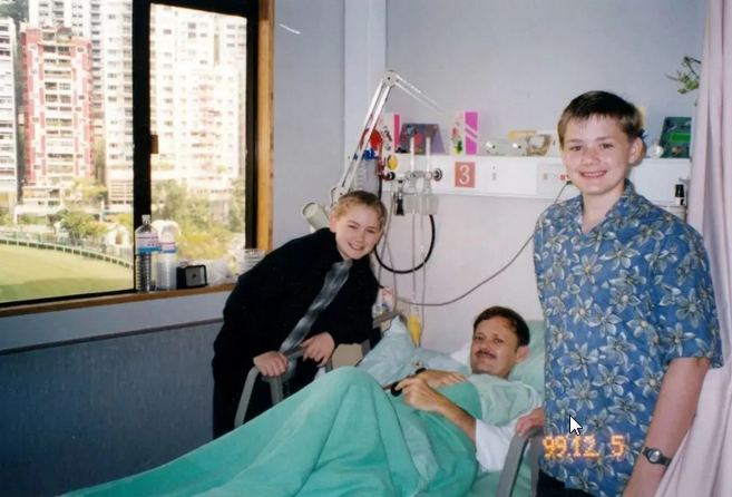 1999年潘維廉在香港一家醫(yī)院接受癌癥手術(shù),和家人在一起。(圖源:人民日報客戶端)