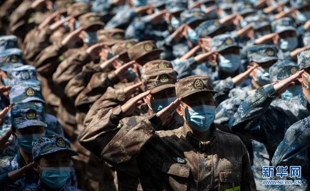 2020年4月15日,最后一批回撤的軍隊支援湖北醫(yī)療隊隊員向火神山醫(yī)院敬禮告別。新華社記者 費(fèi)茂華 攝
