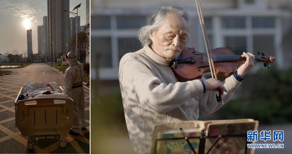 這是一張拼版照片,左圖為:2020年3月5日傍晚,在湖北省武漢大學(xué)人民醫(yī)院東院,復(fù)旦大學(xué)附屬中山醫(yī)院支援湖北醫(yī)療隊醫(yī)生在護(hù)送患者王欣做CT的途中停下,讓住院近一個月的老人欣賞久違的日落(甘俊超 攝);右圖為:3月24日,“看夕陽的老人”王欣在東西湖區(qū)園藝花城小區(qū)內(nèi)拉小提琴(新華社記者熊琦攝)。新華社發(fā)