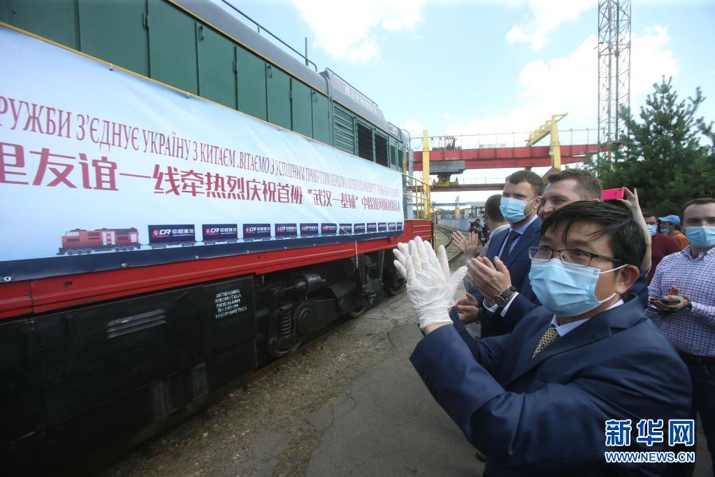 2020年7月6日,在烏克蘭首都基輔市利斯基貨運(yùn)站,中烏兩國代表迎接“武漢—基輔”中歐班列。該班列是中國華中地區(qū)首列直達(dá)烏克蘭的中歐班列。新華社發(fā)(謝爾蓋·斯塔拉斯堅科攝)