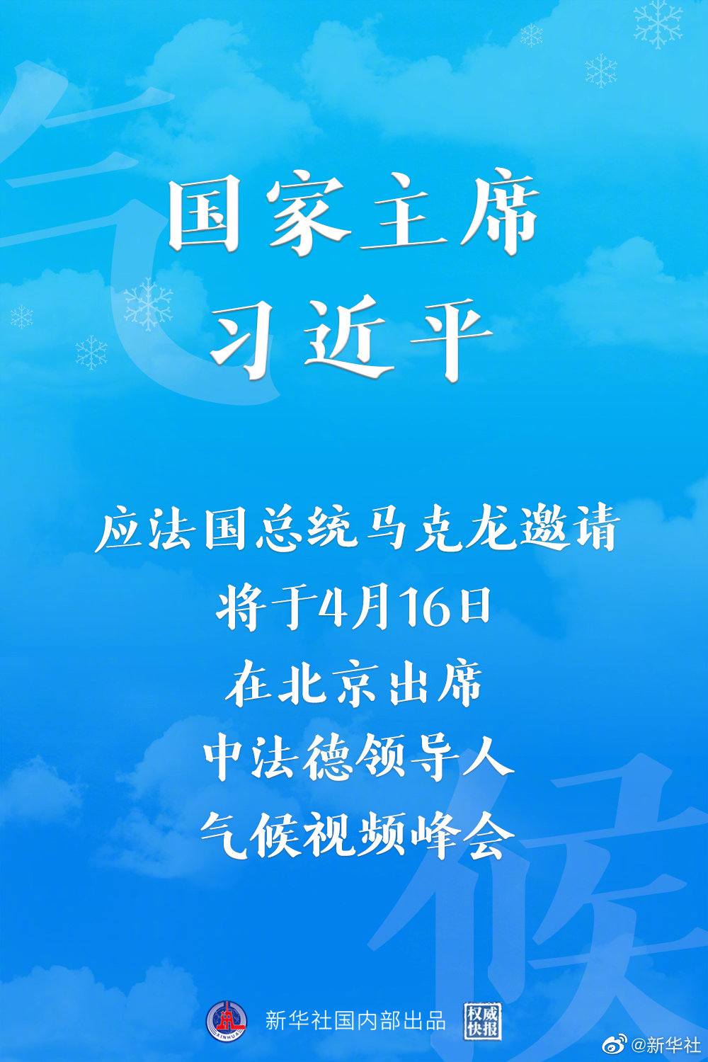 外交部發(fā)言人華春瑩15日宣布:應法國總統(tǒng)馬克龍邀請,國家主席習近平將于4月16日在北京出席中法德領(lǐng)導人氣候視頻峰會。 ​​​​