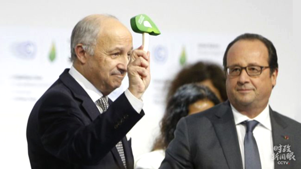 △2015年12月12日,巴黎氣候變化大會主席、法國外長法比尤斯舉起帶有大會標(biāo)志的綠色小錘,宣告里程碑式的《巴黎協(xié)定》誕生。(資料圖)