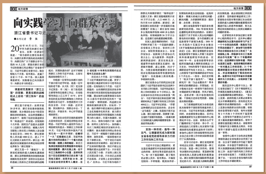 時(shí)任新華社浙江分社社長(zhǎng)的費(fèi)強(qiáng),曾多次隨習(xí)近平參加基層調(diào)研。2003年3月17日第11期、2004年4月12日第15期《瞭望》先后刊發(fā)了費(fèi)強(qiáng)采寫(xiě)的深度報(bào)道《向?qū)嵺`學(xué)習(xí) 向群眾學(xué)習(xí)——浙江省委書(shū)記習(xí)近平調(diào)研紀(jì)實(shí)》《從“調(diào)研開(kāi)局”到“調(diào)研開(kāi)路”——中共浙江省委常委會(huì)求真務(wù)實(shí)紀(jì)實(shí)》。文章記錄了習(xí)近平同志任浙江省委書(shū)記期間,以特色鮮明的基層調(diào)研迅速打開(kāi)工作局面的生動(dòng)過(guò)程。