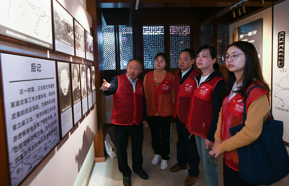 ↑2021年4月23日,浙江慈溪市錢海軍志愿服務中心黨支部的黨員在浙東抗日根據(jù)地舊址參觀學習。
