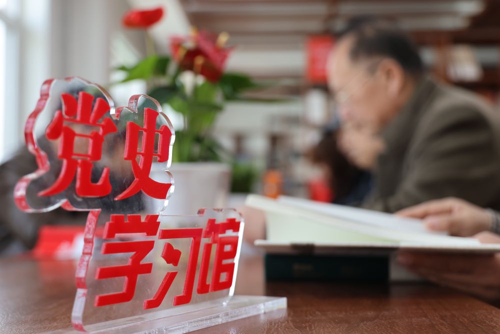 ↑2021年3月16日,人們在河北黃驊市驊中街道信譽樓社區(qū)黨史學習館學習黨史。