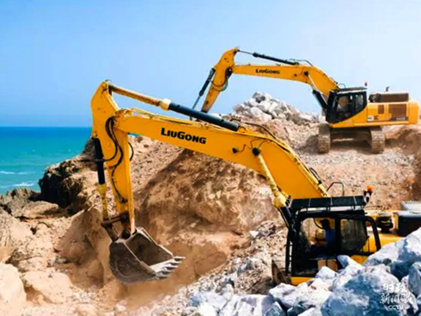 △2017年,摩洛哥首都拉巴特,大西洋海岸施工現(xiàn)場,柳工挖掘機進(jìn)行大塊石料的堆積作業(yè)。(資料圖)