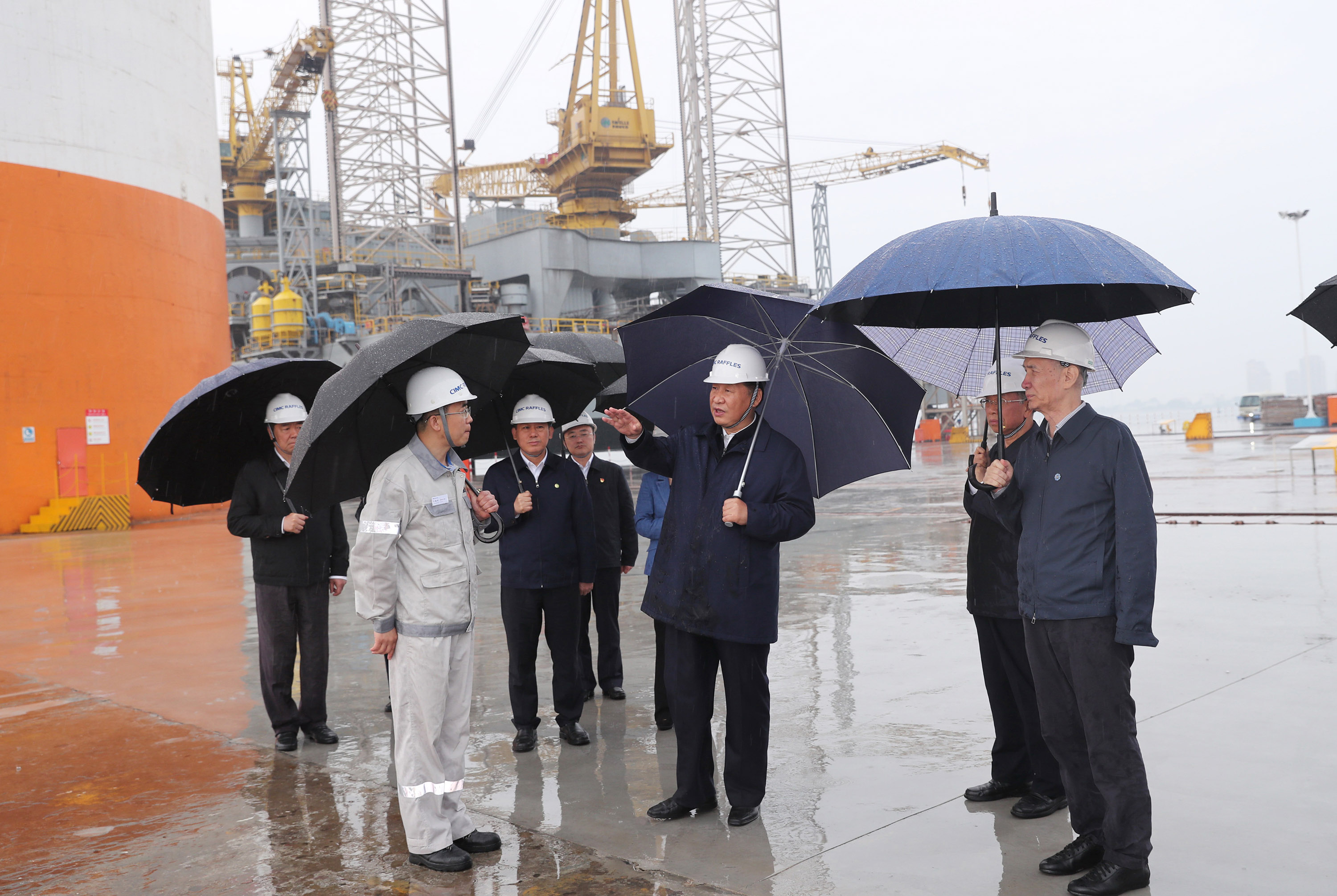 ↑2018年6月13日,習(xí)近平在山東煙臺(tái)考察,冒雨來(lái)到中集來(lái)福士海洋工程有限公司煙臺(tái)基地,視察海洋工程設(shè)備建設(shè)場(chǎng)地。