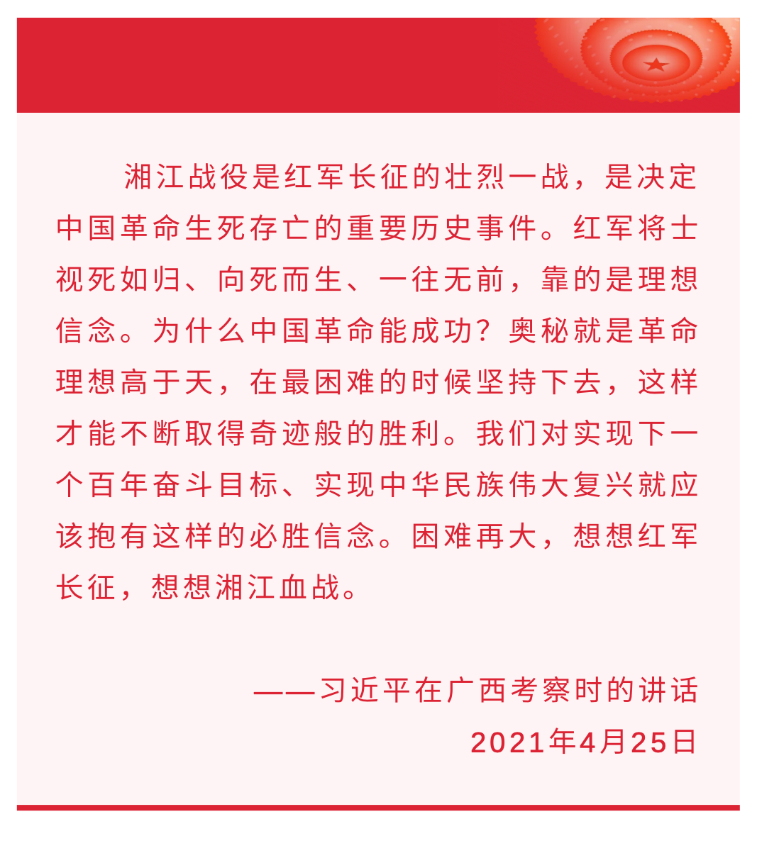 1934年11月下旬至12月上旬,為確保中共中央和中央紅軍主力渡過湘江,粉碎敵人圍殲紅軍于湘江以東的企圖,數(shù)萬紅軍將士浴血奮戰(zhàn),譜寫了一曲壯麗的革命史詩。