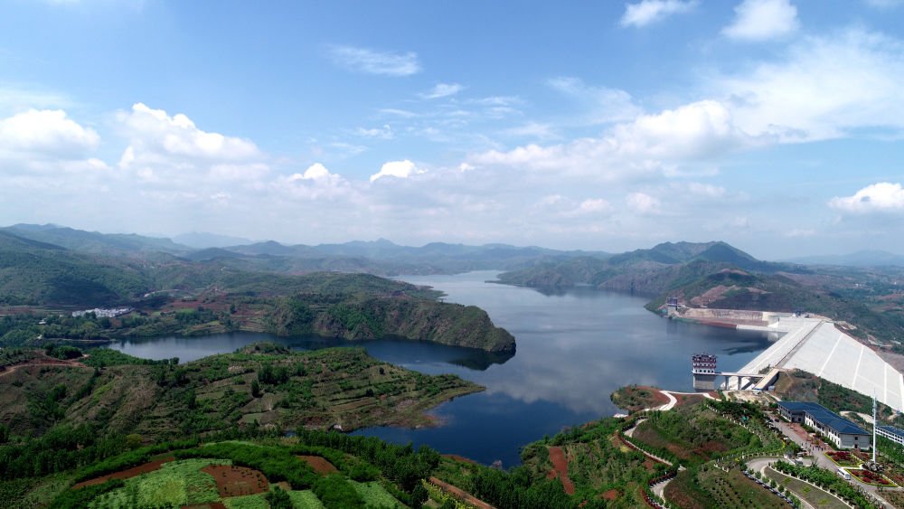 ↑位于河南省汝陽縣前坪村的前坪水庫,是一座以防洪為主,兼具供水、灌溉、發(fā)電功能的大型水利樞紐工程,是國務(wù)院確立的172項節(jié)水供水重大水利工程之一(無人機(jī)照片,4月26日攝)。