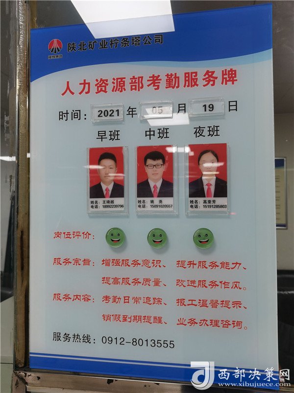 西部決策網(wǎng)訊 在黨史學(xué)習(xí)教育活動(dòng)中,開(kāi)展“我為群眾辦實(shí)事”實(shí)踐活動(dòng)是公司黨史學(xué)習(xí)教育實(shí)施方案中的一項(xiàng)重點(diǎn)任務(wù)。為及時(shí)了解和掌握員工考勤動(dòng)態(tài),妥善處理和解決好員工考勤中的難點(diǎn)問(wèn)題,增強(qiáng)員工獲得感、幸福感、安全感,陜北礦業(yè)檸條塔公司人力資源部結(jié)合實(shí)際,把學(xué)黨史與為員工辦實(shí)事相結(jié)合,增設(shè)一面“考勤服務(wù)牌”。