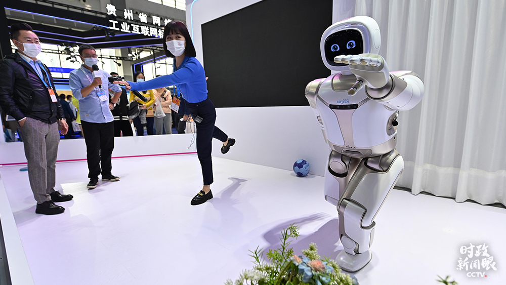 △2021年5月,貴陽,參會(huì)者在數(shù)博會(huì)上觀看一款能澆花、遞送飲料、踢球的智能機(jī)器人。(圖/視覺中國)