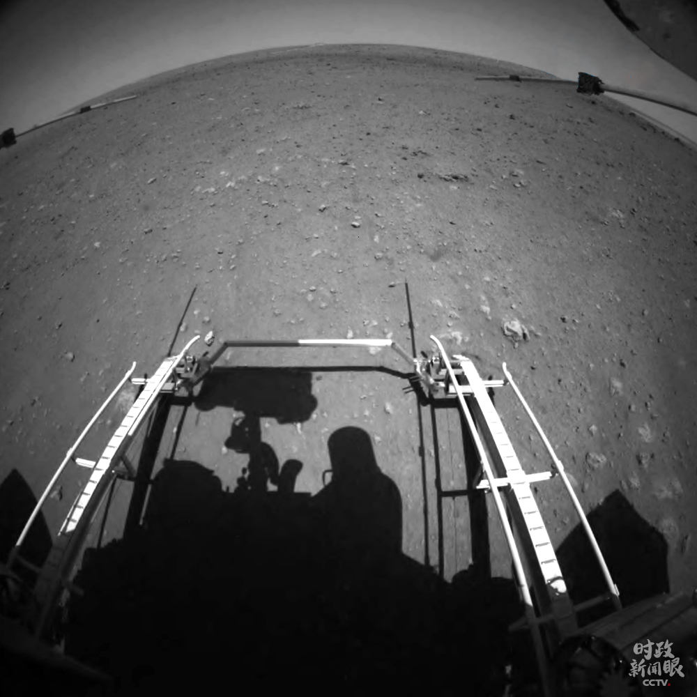 △2021年5月22日,“祝融號(hào)”火星車安全駛離著陸平臺(tái),到達(dá)火星表面,開始巡視探測。(圖/國家航天局)