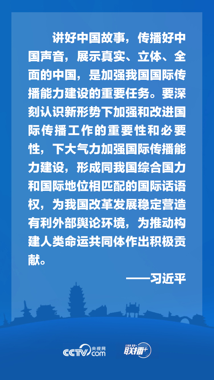 黨的十八大以來,我國(guó)大力推動(dòng)國(guó)際傳播守正創(chuàng)新,理順內(nèi)宣外宣體制,打造具有國(guó)際影響力的媒體集群,積極推動(dòng)中華文化走出去,有效開展國(guó)際輿論引導(dǎo)和輿論斗爭(zhēng),初步構(gòu)建起多主體、立體式的大外宣格局,國(guó)際話語權(quán)和影響力顯著提升。面對(duì)新的形勢(shì)和任務(wù),應(yīng)如何加強(qiáng)我國(guó)國(guó)際傳播能力建設(shè)?央視網(wǎng)《聯(lián)播+》特梳理總書記講話要點(diǎn),與您一起學(xué)習(xí)領(lǐng)悟。
